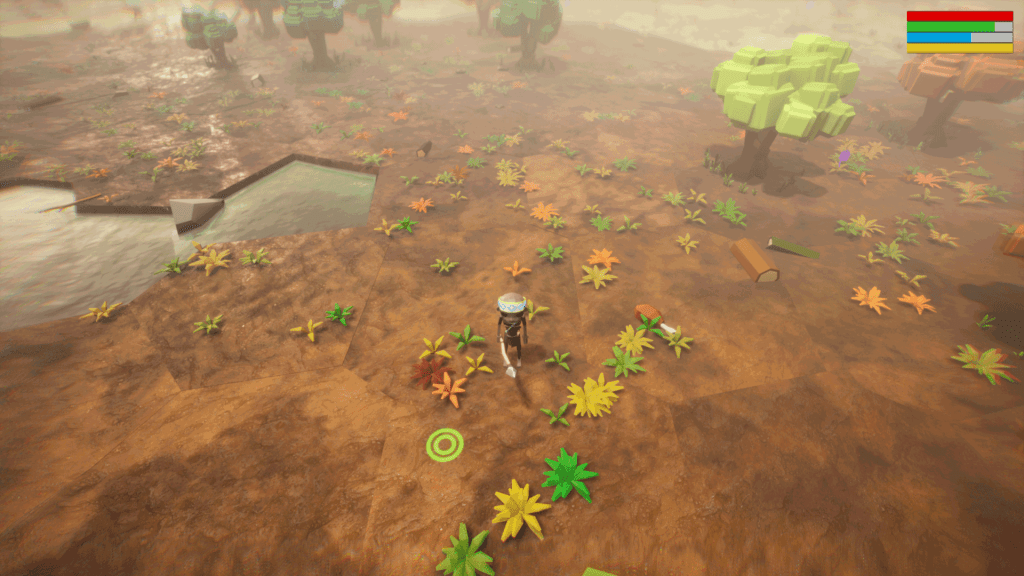 2022_JULY: Testing different biomes, (oasis), refining trees and lakes. Tried stylized caves with boxes—didn’t quite work. Experimenting with different character assets