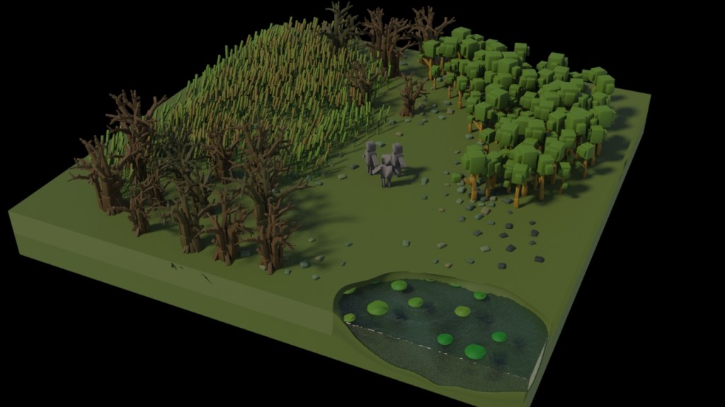 2022_JULY In our first concept work, we embraced strict design rules—only cubes, no smooth surfaces. Characters and vegetation got a rough look. Extended rules for a bit more complexity.