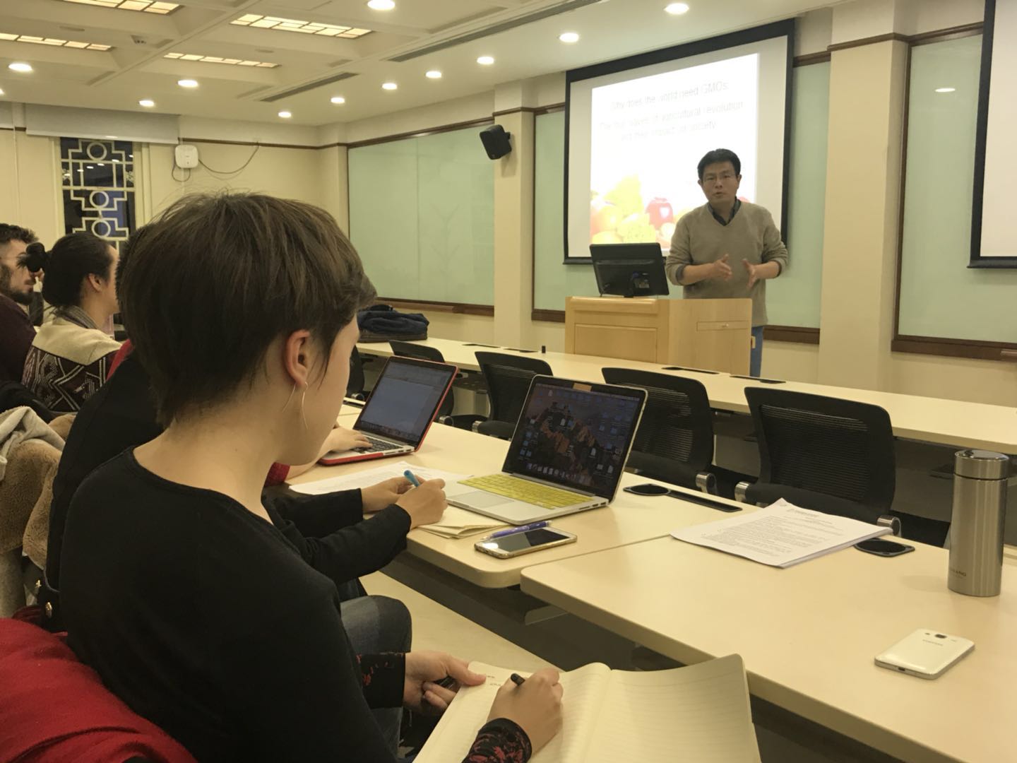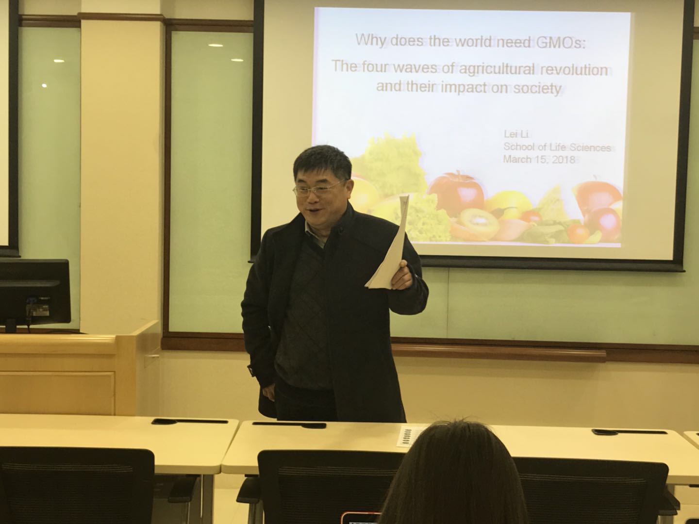 首次课程由生命科学学院李磊研究员主讲,题目为“Why does the world need GMOs: The four waves of agricultural revolution and their impact on society”。他从我们熟知的日常食物和植物的光合作用展开,阐述了植物对我们生活的重要性。植物在人类历史上举足轻重,从外来物种的引入和本地化,到“绿色革命”,再到转基因,无一不对国家和社会产生着重大影响。结合中国和世界的农业发展及粮食需求,李磊老师和同学们探讨了转基因及其引发的一系列社会问题,现场气氛热烈。
